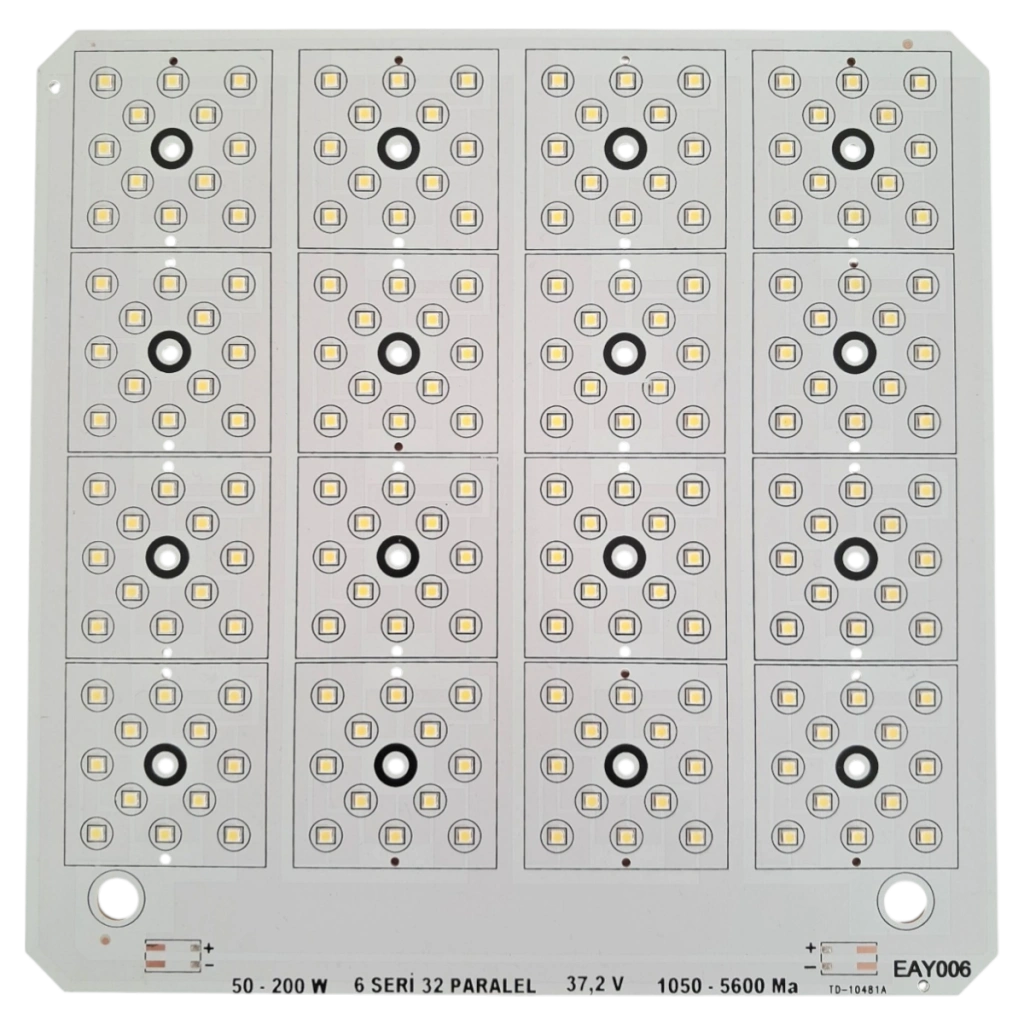 Modül üzerinde toplam 192 adet 3030 SMD LED bulunmaktadır. 6 seri – 32 paralel LED dizilimi sayesinde sabit akım sürücüler ile uyumlu şekilde çalışarak yüksek verimli aydınlatma sağlar. 1050 mA ile 5600 mA arasında farklı akım değerlerinde kullanılabilen bu LED modül, uygulamaya bağlı olarak 75W ile 200W arasında güç seçenekleri sunar.