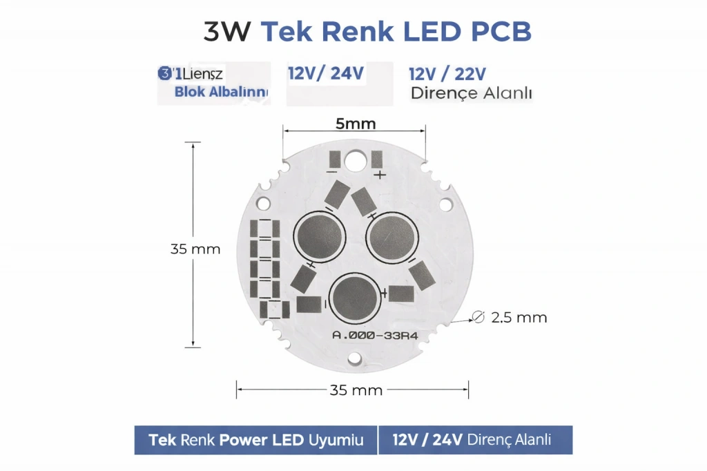 35 mm çapında tasarlanan bu alüminyum LED PCB, 3 adet power LED montajına uygun yapısı ve üzerinde bulunan SMD direnç dizilim alanı ile hem 12V hem de 24V sistemlerde çalışmaya uygun esnek bir altyapı sunar.