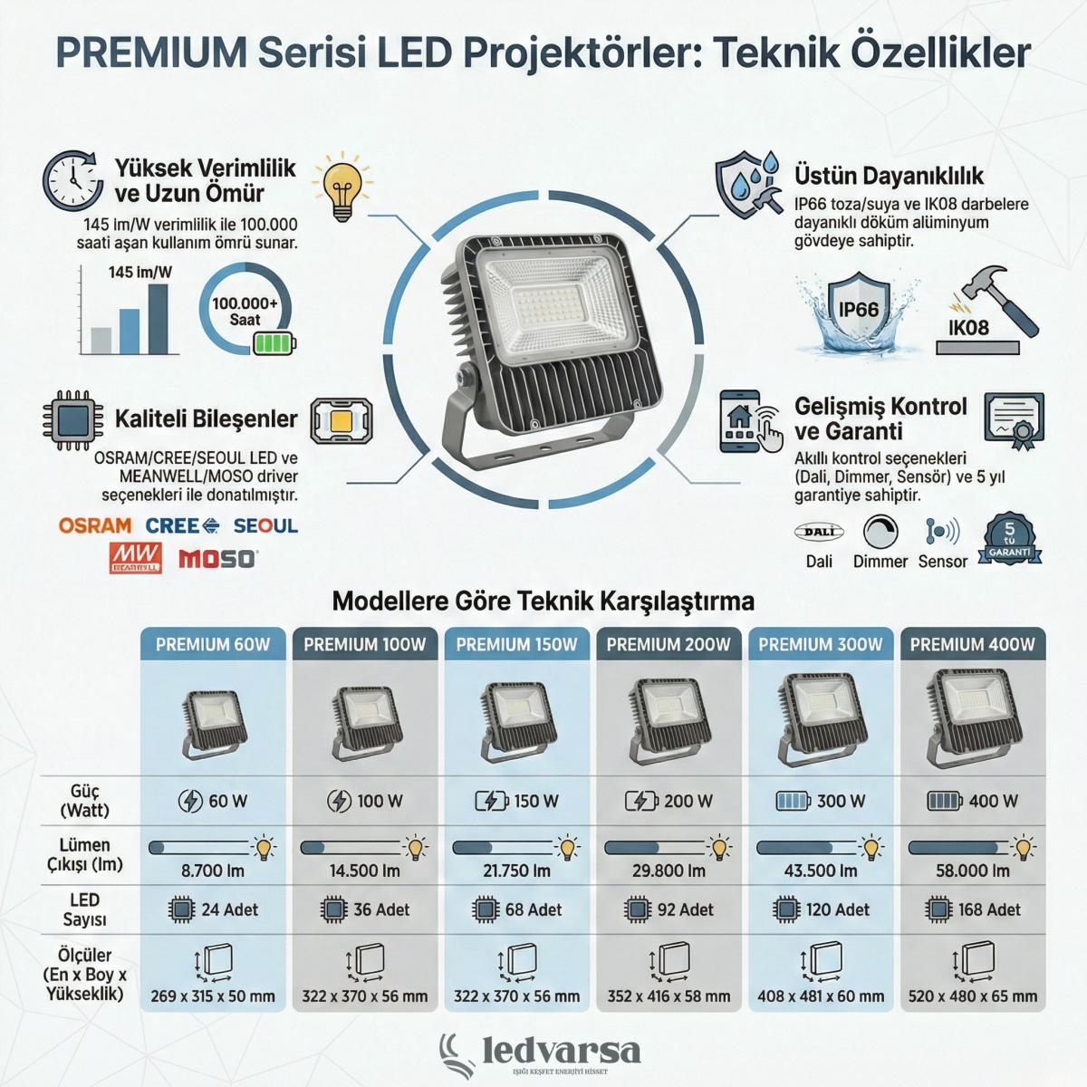LEDVARSA PREMIUM serisi, bir projektörün sadece lümen ve watt değerlerinden ibaret olmadığını gösteriyor. O, dayanıklı mühendislik, tutarlı verimlilik ve akıllı teknolojinin bir sentezidir. Yıllara meydan okuyan yapısı, her koşulda değişmeyen performansı ve geleceğe dönük kontrol yetenekleriyle aydınlatma projelerindeki beklentileri yeniden tanımlıyor. Şimdi sormamız gereken soru şu: Bir aydınlatma projesinde aradığınız sadece lümen değeri mi, yoksa yıllarca sürecek bir teknoloji yatırımı ve güvence mi?