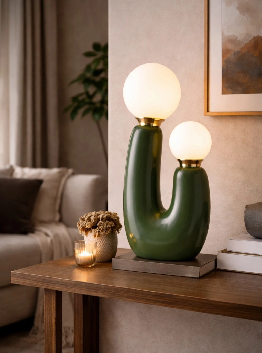 Fabris Modern Yeşil & Pirinç Masa Lambası, asimetrik ve heykelsi tasarımıyla çalışma masanıza veya yaşam alanlarınıza güçlü bir görsel vurgu katar.
