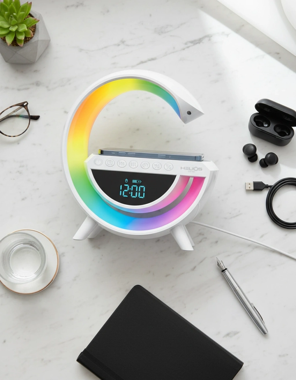 Çalışma masanızı veya yaşam alanınızı sıradanlıktan kurtaracak, teknoloji ve estetiği bir araya getiren bu akıllı masa lambasıyla tanışın. Sadece bir aydınlatma aracı değil, aynı zamanda kablosuz şarj istasyonu, güçlü bir Bluetooth hoparlör ve şık bir dijital saat olan bu ürün, tüm ihtiyaçlarınızı tek bir noktada toplar.