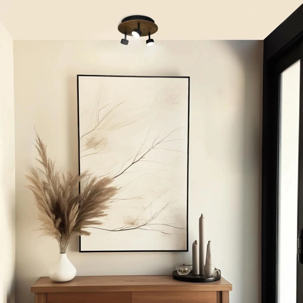 3 adet dışa dönük LED spot sayesinde ışık, özellikle koridor, yatak odası, küçük salon alanları ve ofis bölümleri için odaklı ve dengeli aydınlatma sunar. Modern ahşap çember tasarımı, mekâna doğal ve estetik bir dokunuş katar.